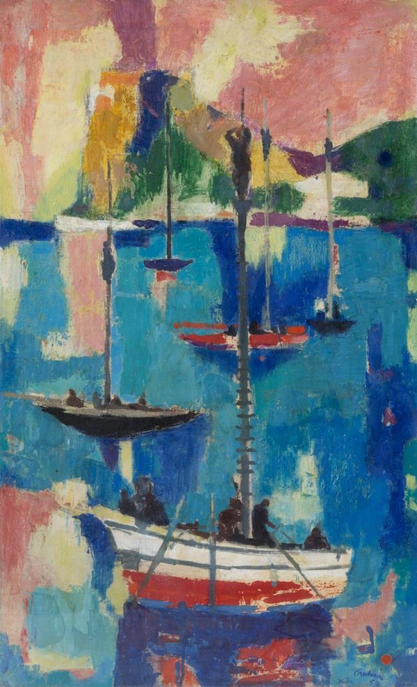 Oil painting on canvas entitled ''FISHING FOR SWORDFISH''. Signed and dated '57 lower right. Nino Cali collection. With cartouche of the Villa San Giovanni 1957 award on the back. In frame.