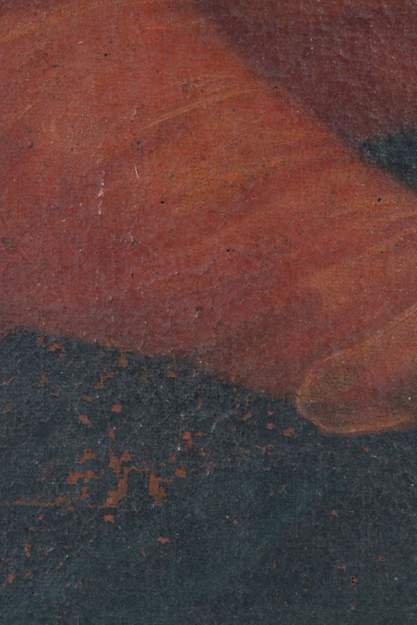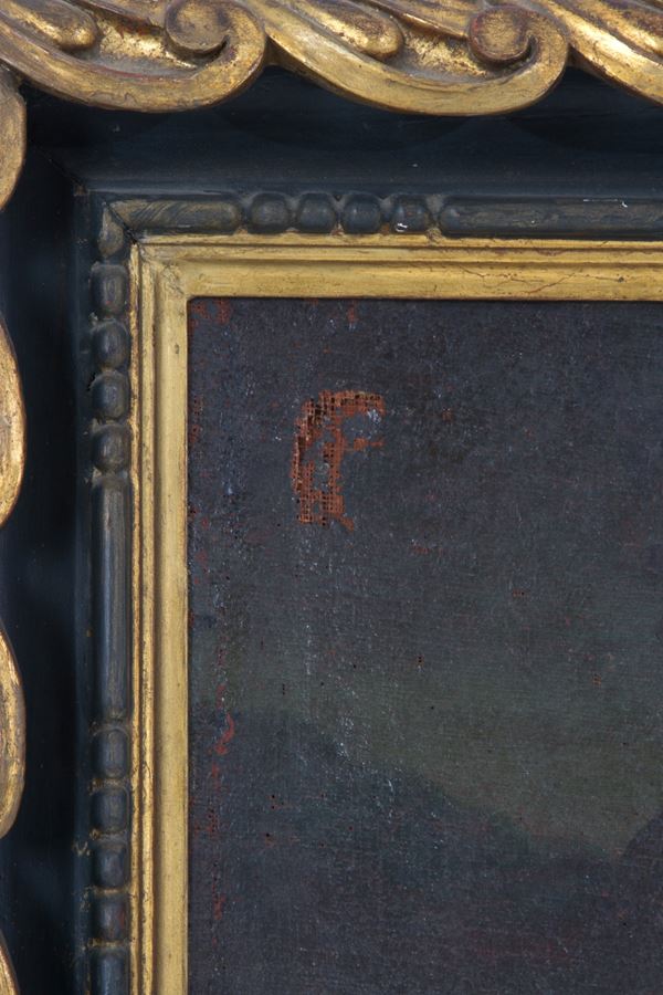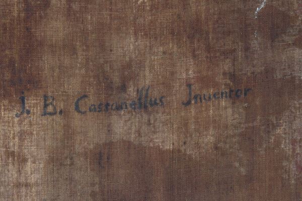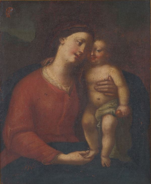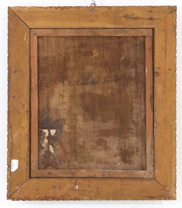 Oil painting on canvas depicting "MADONNA WITH CHILD". Inscribed 'J.b. Cassanellus Inventor' on the reverse. 17th century. In carved and gilded frame. Already reframed. Defects.
