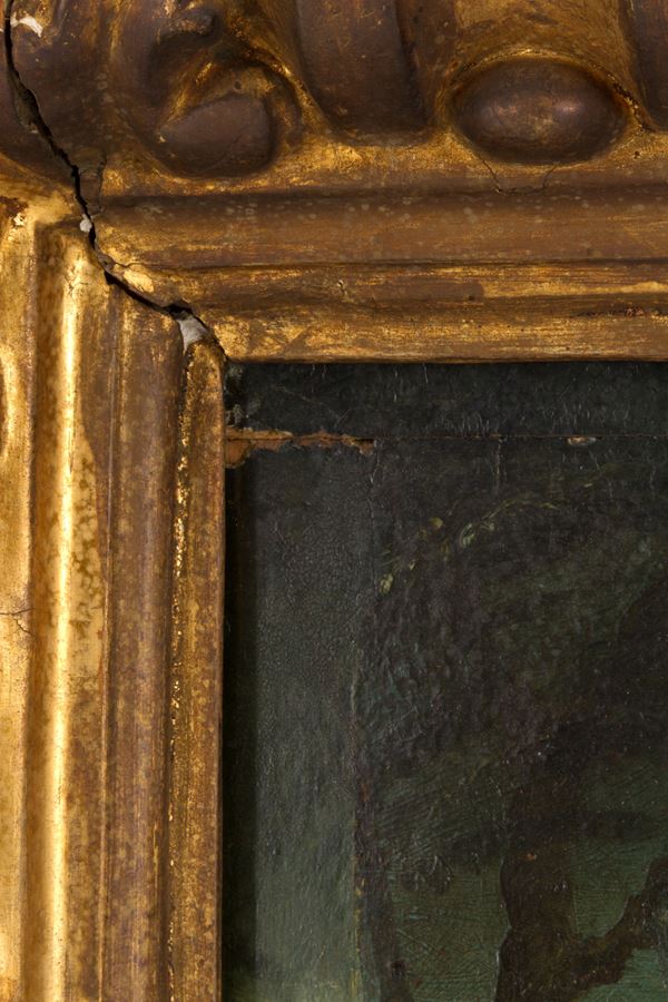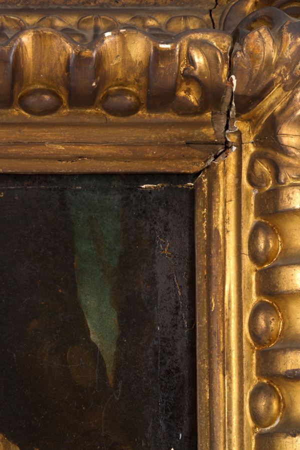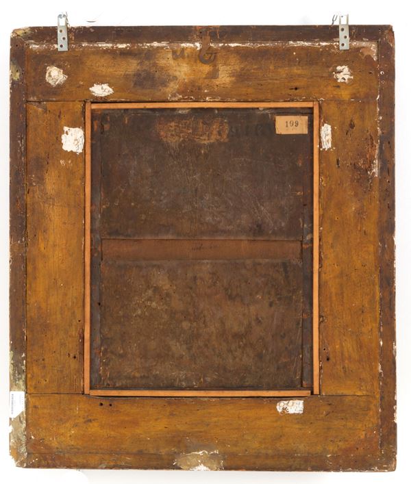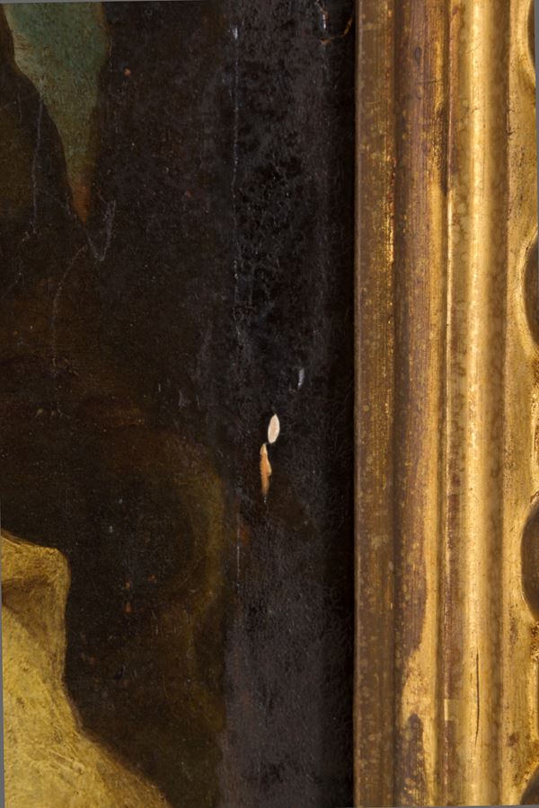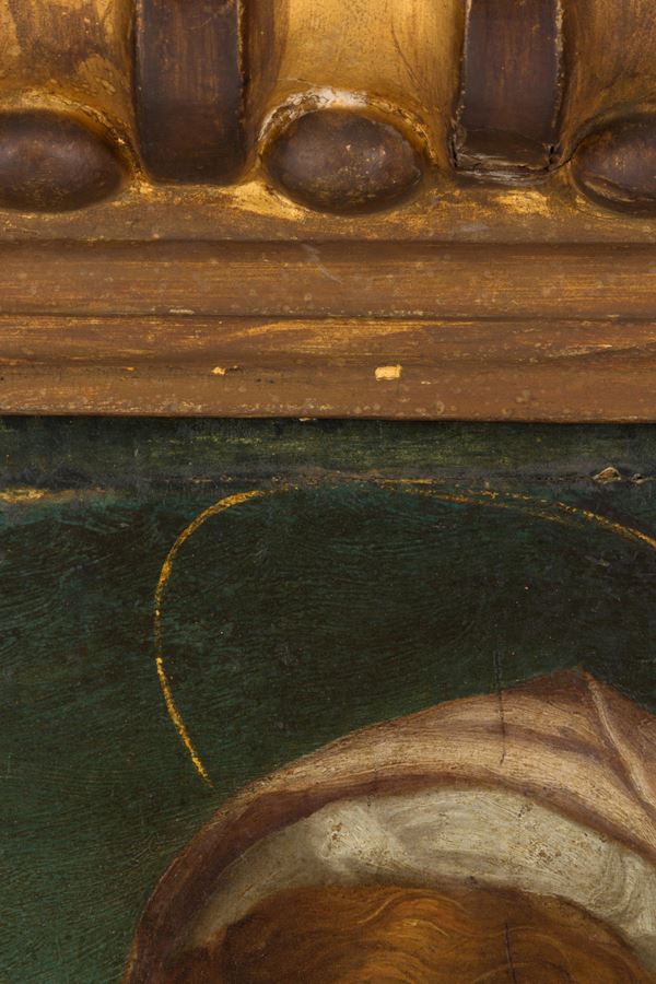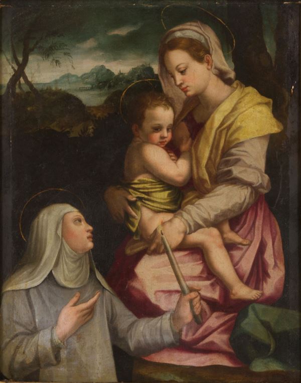 Oil painting on panel depicting "MADONNA WITH CHILD AND SAINT". Second half of the 16th century. In a beautiful period frame.