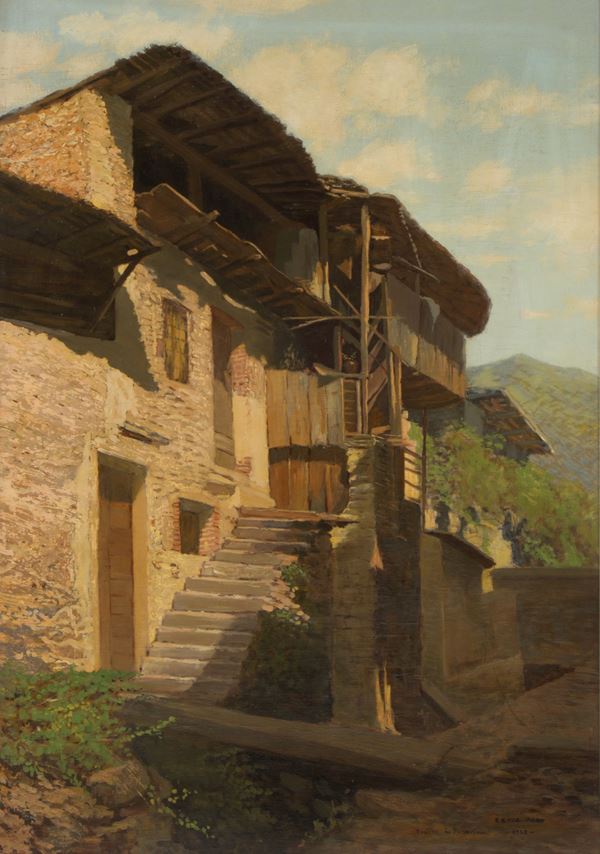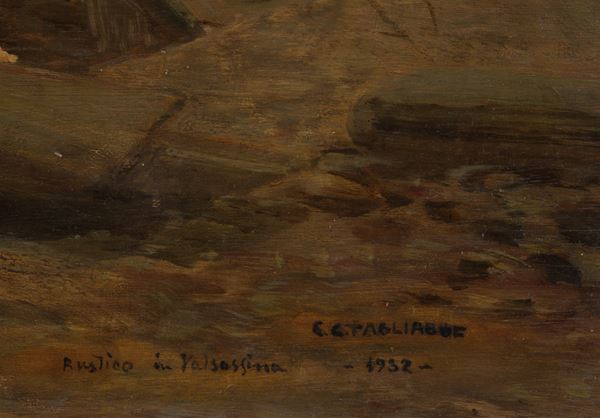 Oil painting on plywood entitled "RUSTIC IN VALSASSINA". Signed and dated 1932 lower right. In frame.