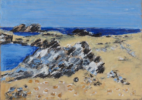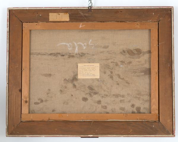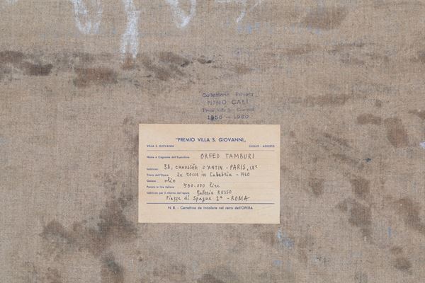 Oil painting on canvas entitled ''THE ROCKS IN CALABRIA''. Signed lower right. 1960. Nino Calì collection. With scroll of the Villa San Giovanni 1960 award. Framed. Defects.