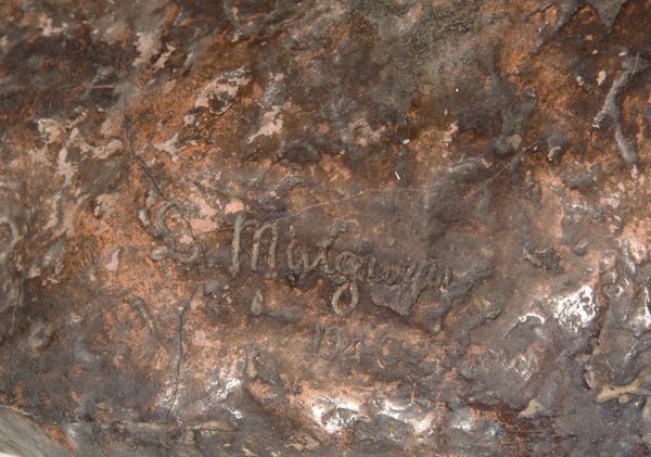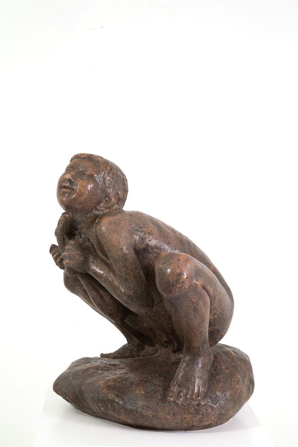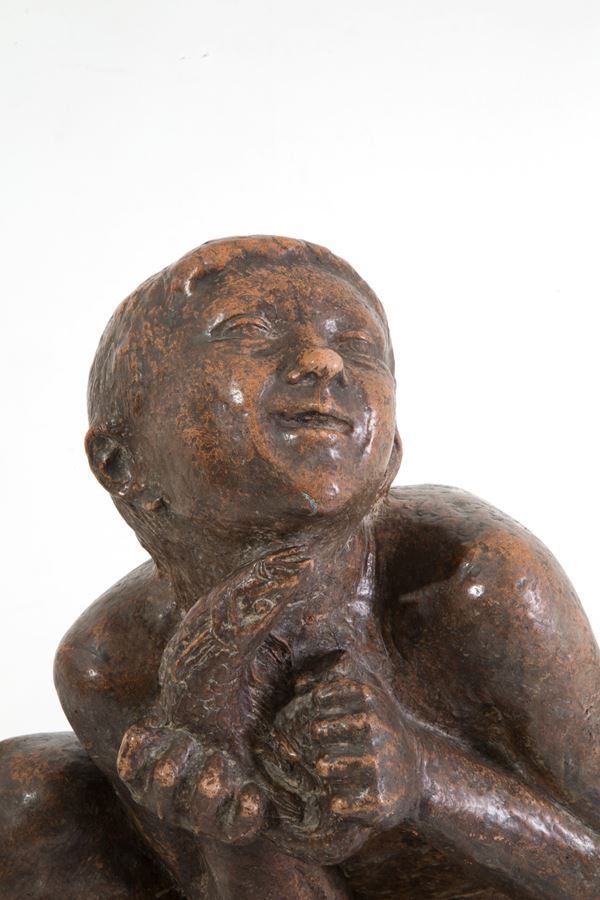 Terracotta sculpture depicting "YOU WITH FISH IN HAND". Signed and dated 1940 on the base.