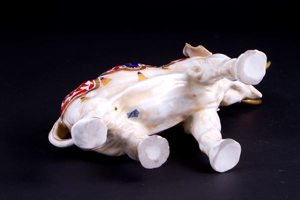 Porcelain statuette painted in Chinoiserie depicting "ELEPHANT". CAPODIMONTE marked. Late 19th century. Defects to the horn.