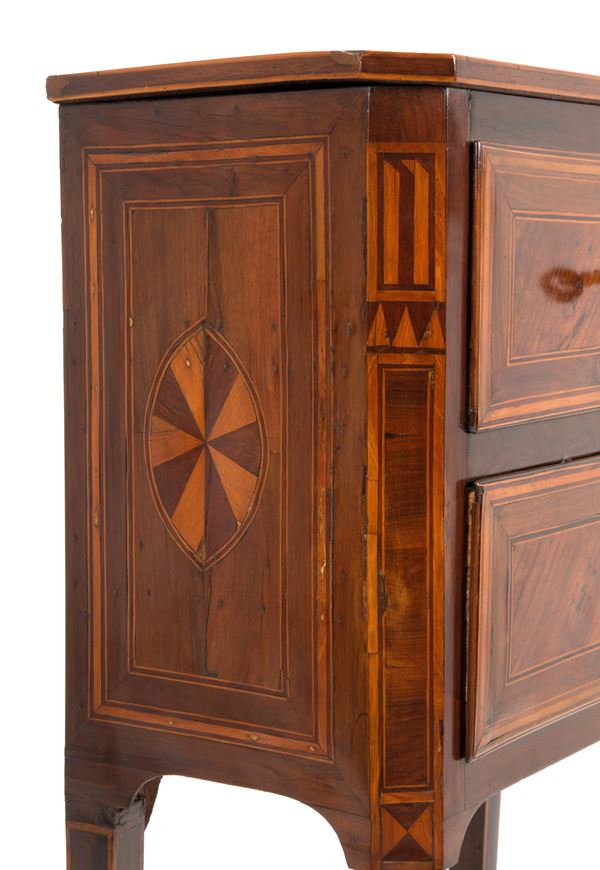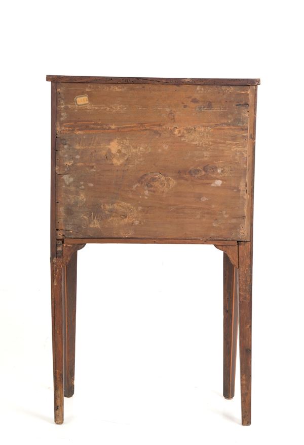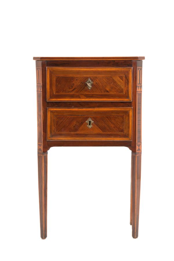 Bedside table in veneered and inlaid wood with tapered legs and two drawers on the front. Naples. 18th century.