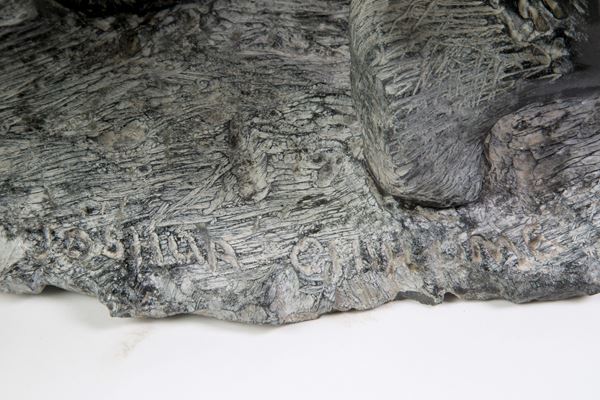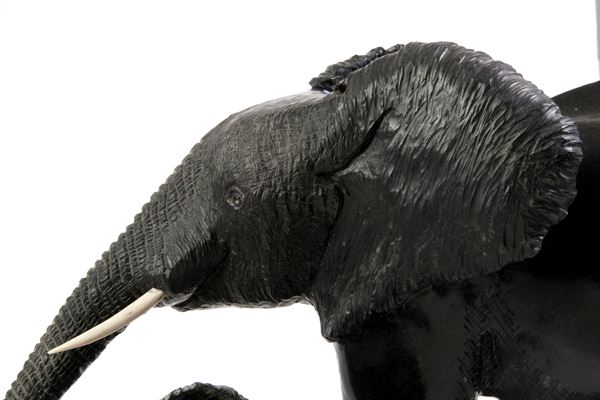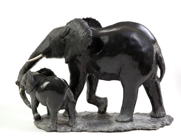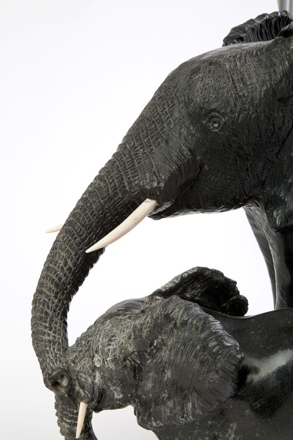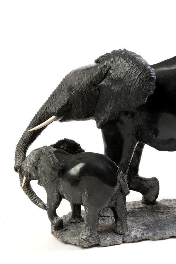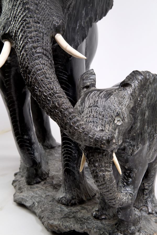 Black marble sculpture depicting ''ELEPHANT WITH A LITTLE ELEPHANT''. Signed on the base.