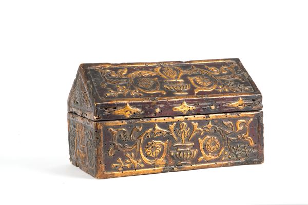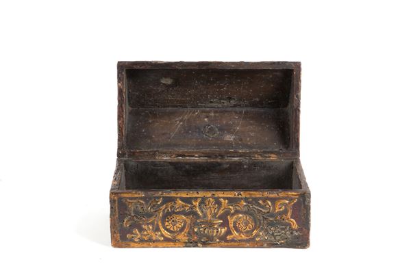 Casket in carved and gilded wood with floral motifs. Sealing wax stamp inside. Northern Italy. Late 16th century. Defects.