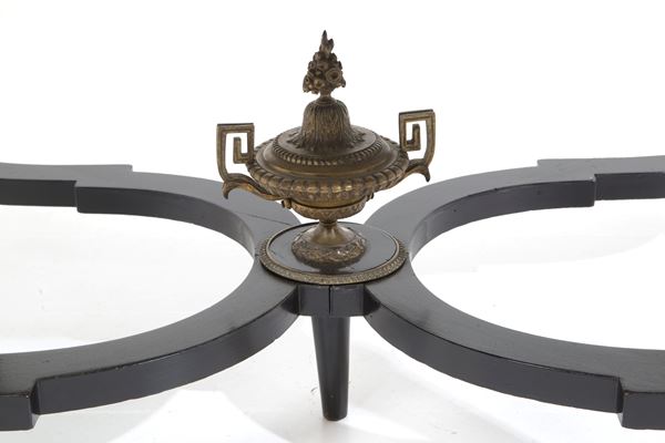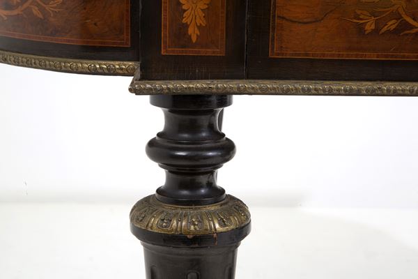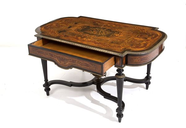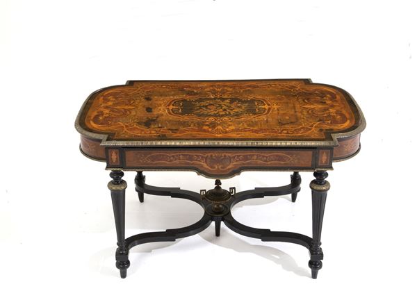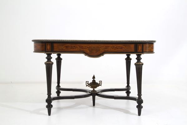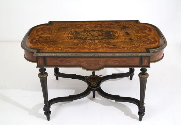 Center table in inlaid wood with floral motifs with gilt bronze trim, drawer on the band and legs joined by crosspieces with gilt bronze vase in the centre. Napoleon III period. Defects.