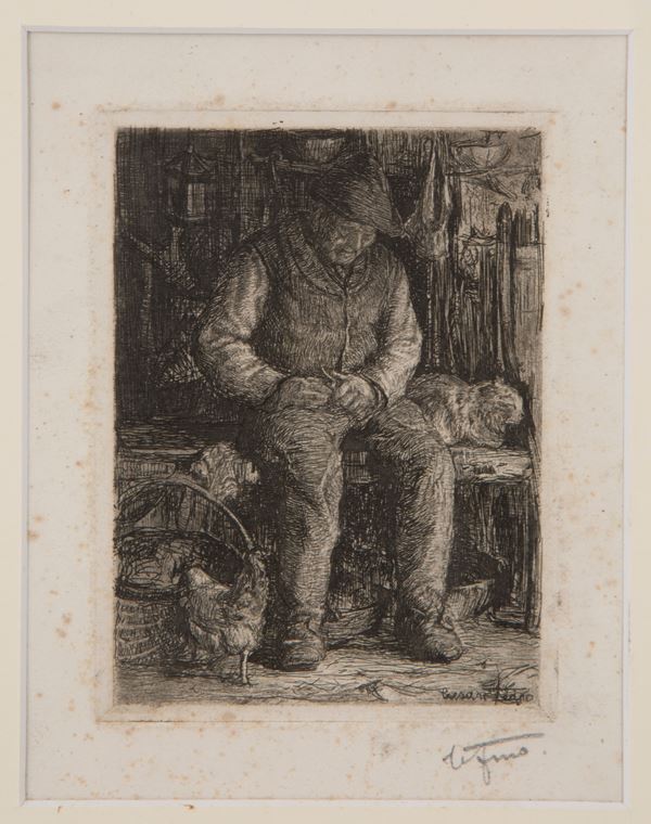 Engraving on paper depicting "FARMER WITH CAT". Signed lower right. In a beautiful frame.