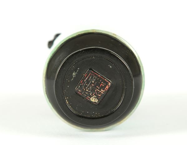 Snuff bottle in green jade, ebonized wood and turquoise top. Dog shaped handles. China.