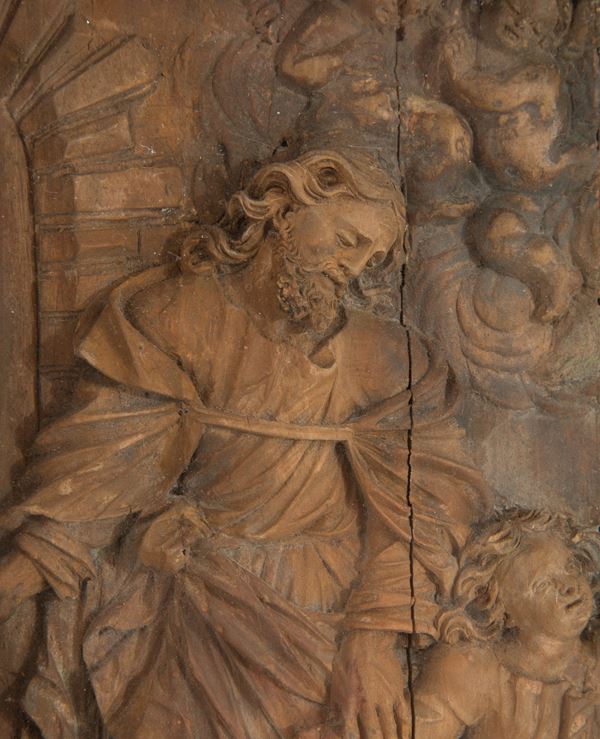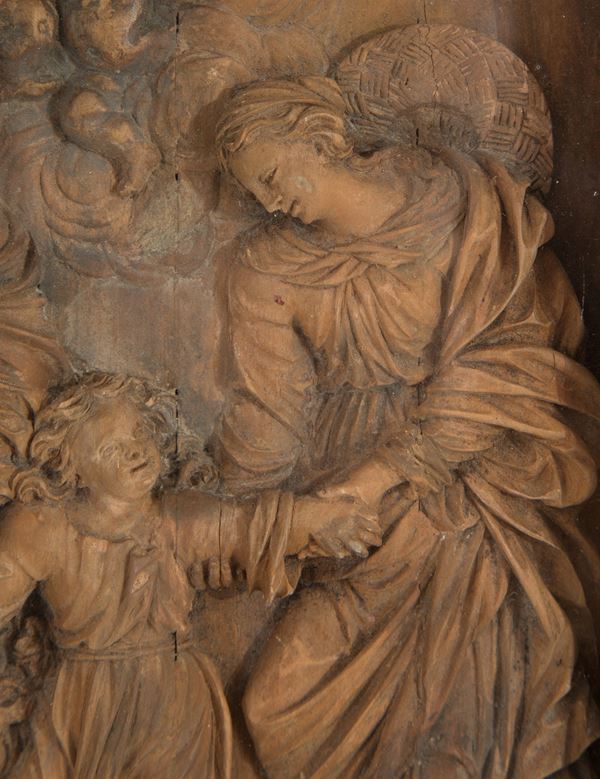 Carved wooden high relief depicting "HOLY FAMILY". Veneto. Late 17th-early 18th century. In a silver frame.