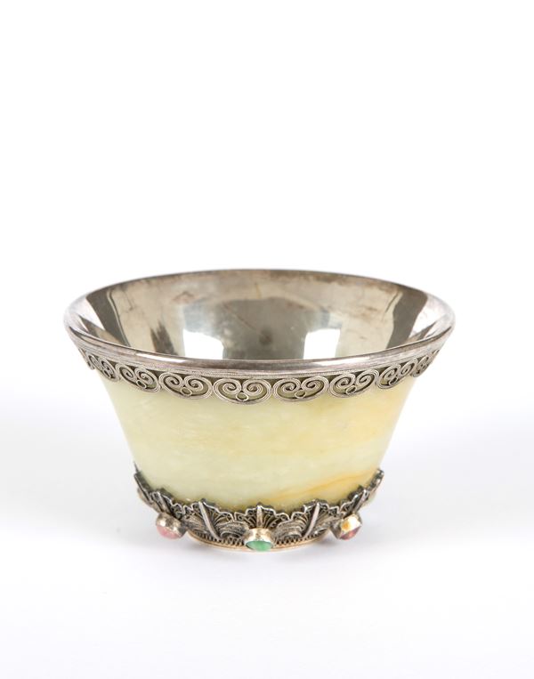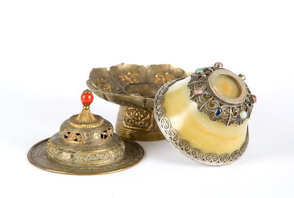 Perfume burner in embossed and gilded silver with floral and geometric motifs with jade cup and hard stone knob. Tibet.