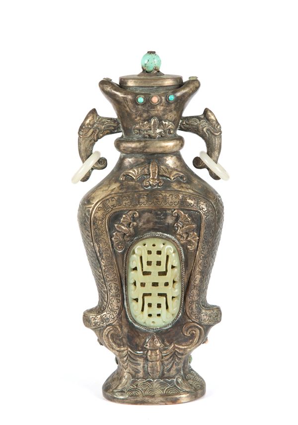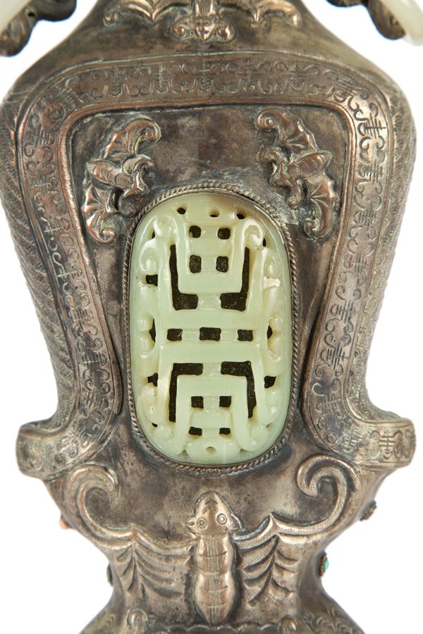 Vase with lid in embossed silver in the shape of bats, plaques and semi-precious stones. Fish-shaped handles. China. Defects.