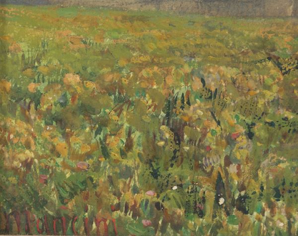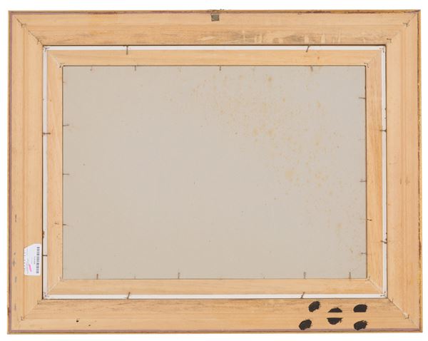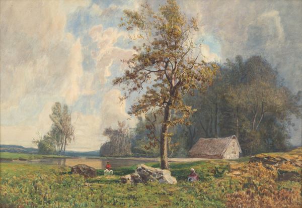 Watercolor on cardboard depicting "LANDSCAPE WITH POND". Signed lower left. In frame.