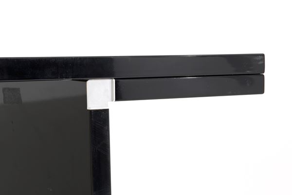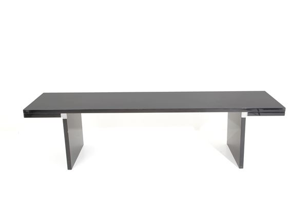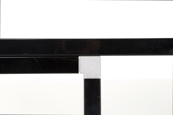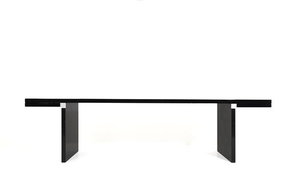 Orseolo table in black lacquered wood with satin finish cast aluminum joints. Manufactured by SIMON, Bologna. With manufacturer's label and designer's signature under the top. 1970s. Usure weather.