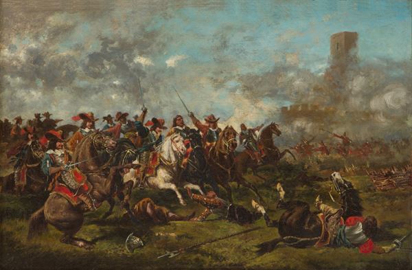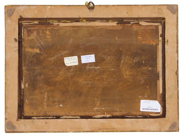 Oil painting on tablet depicting "BATTLE". 19th century. In a gilt frame. Restorations.