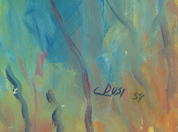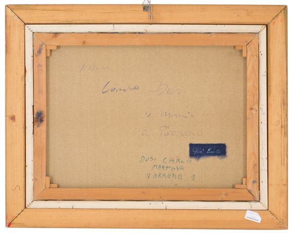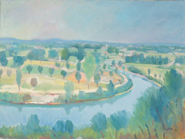 Oil painting on canvas depicting "BEND OF THE MINCIO RIVER". Signed and dated '57 lower right. Countersigned on the back. In frame.