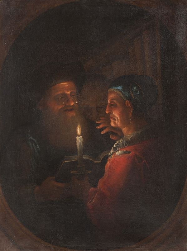 Oil painting on canvas depicting "CHARACTERS READING BY CANDLE LIGHT". Late 17th century. In a gilt frame.