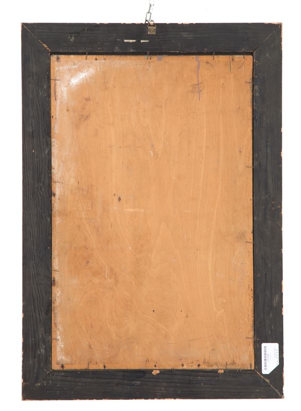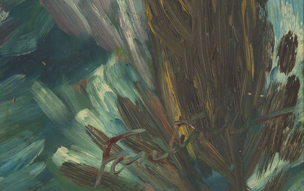 Oil painting on tablet depicting "CYPRESSES". Unidentified signature lower right. In frame.
