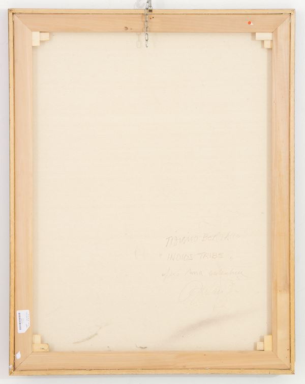 Oil painting on canvas titled "INDIOS TRIBE". Signed lower left. Countersigned, titled and authenticated by the artist on the back. In frame.