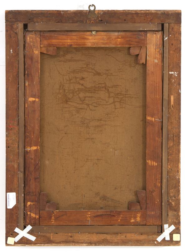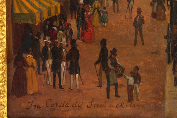 Oil painting on canvas titled "LA CORSIA DEI SERVI A MILANO" in the lower left corner. 19th century. In a gilt frame. Defects.