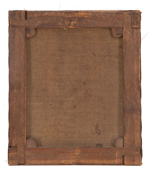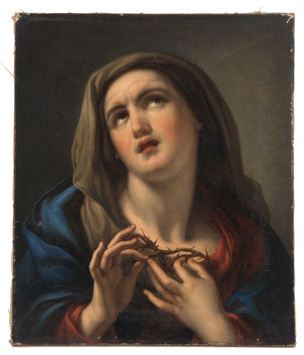 Oil painting on canvas depicting "MADONNA WITH CROWN OF THORNS". 18th century. In gilt frame with slight defects.