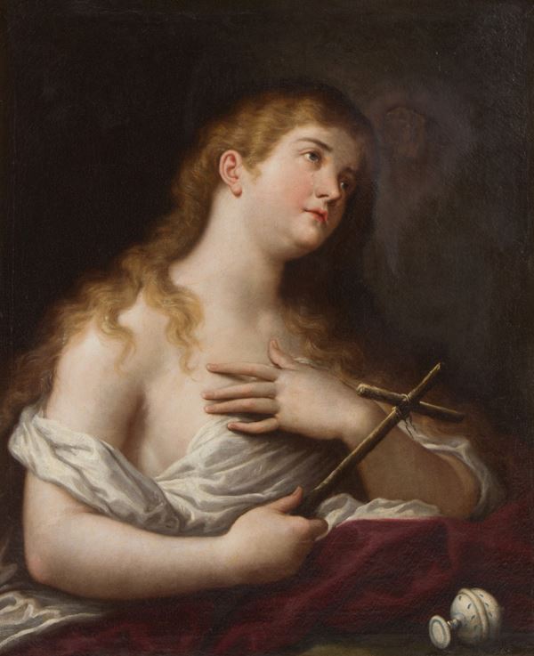 Oil painting on canvas depicting "PENITENT MAGDALENE". 18th century. In a gilt frame. Defects and restorations.