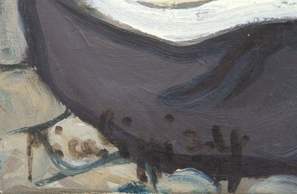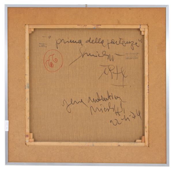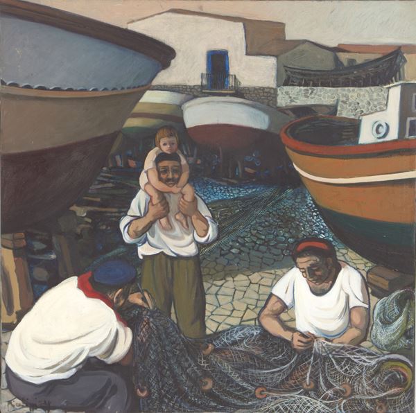 Oil painting on canvas depicting "FISHERS". Signed lower left. Countersigned, titled "PRIMA DELLA PARTENZA" and dated 1974 on the reverse. In frame.