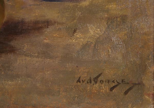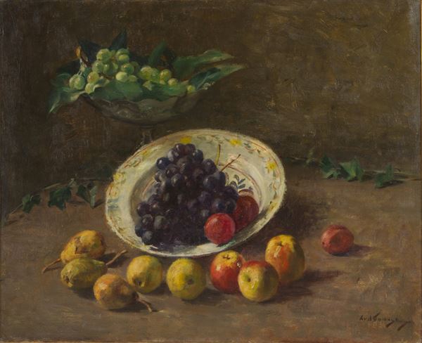 Oil painting on canvas depicting "STILL LIFE WITH GRAPES AND APPLES". Signed lower right. In a gilt frame. Minor restorations. Already relined.
