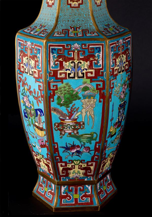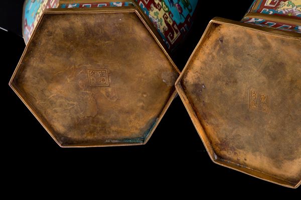 Pair of cloisonné vases with geometric, flower and animal decorations. Marked on the bottom. China. 20th century.