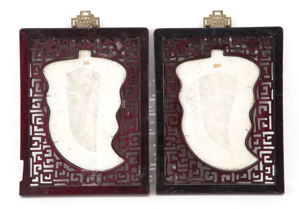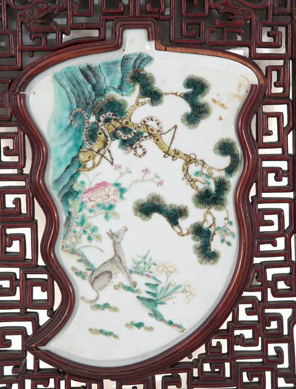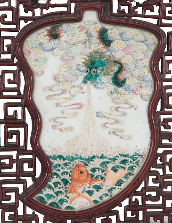Pair of leaf-shaped porcelain plaques depicting "DRAGON WITH FISH" and "SNAKE WITH DEER". Mounted in a perforated wooden frame with geometric motifs. China.