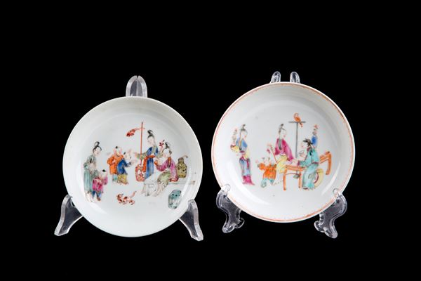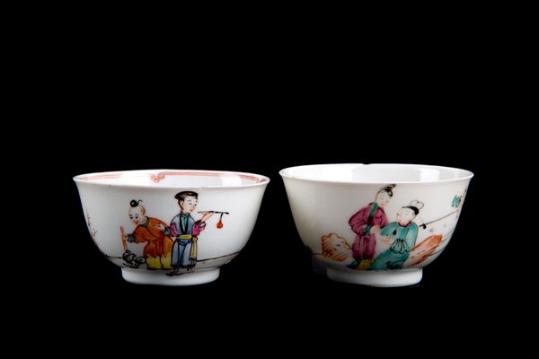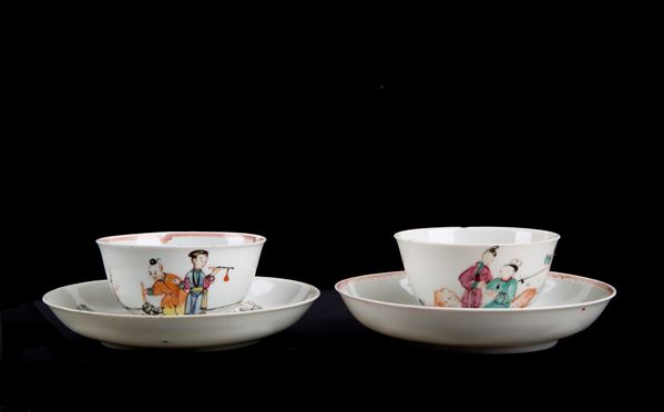 Pair of white porcelain cups and saucers with scenes of oriental life. China. Defects.