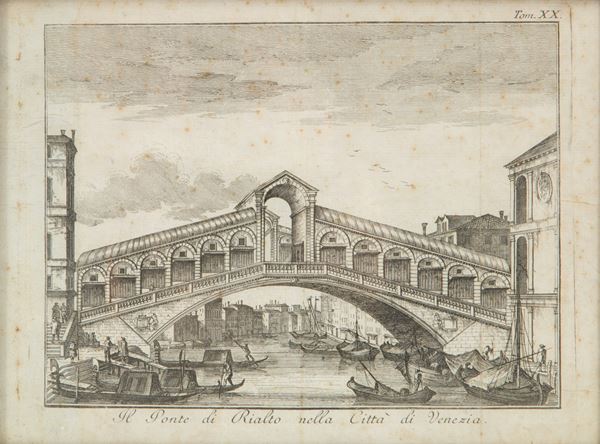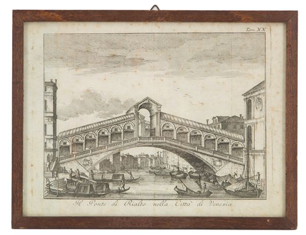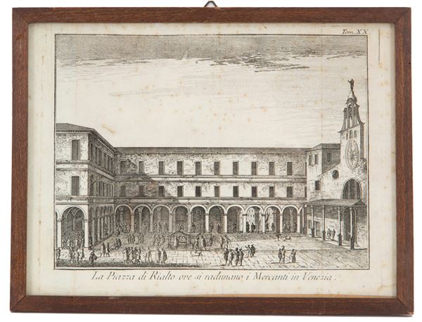 Couple of small etchings on paper depicting "PIAZZA E PONTE DI RIALTO". Venice. XVIII century. In frame.
