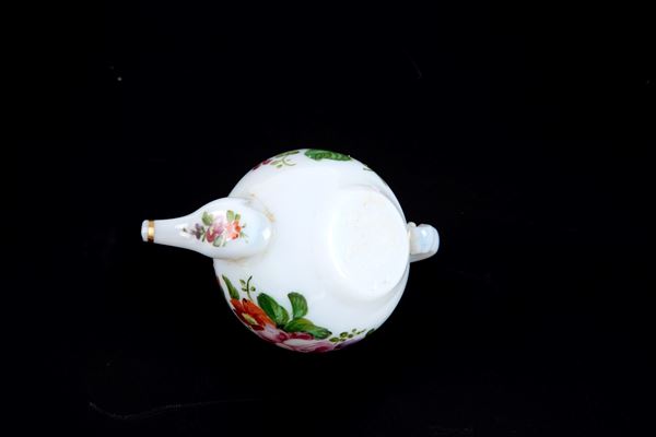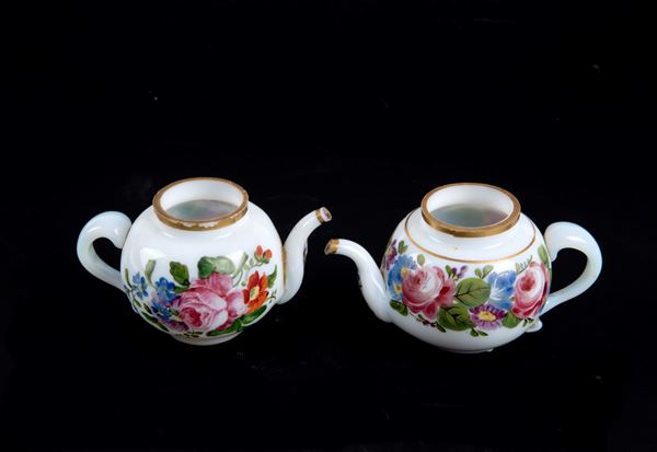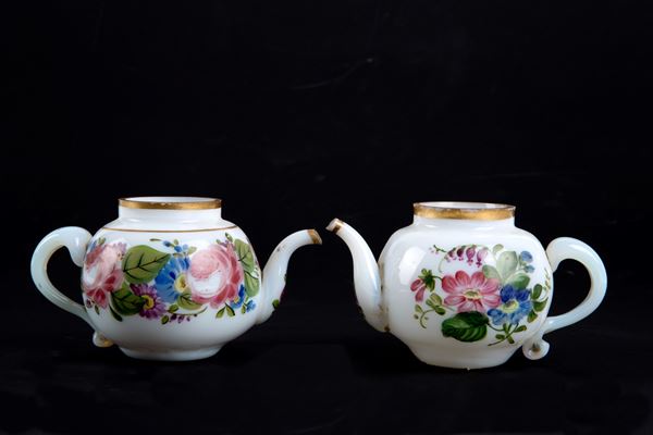 Pair of small milk glass teapots with floral and gold motifs. Venice. Louis Philippe period.