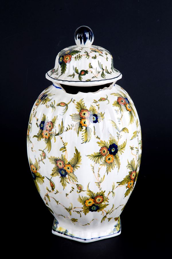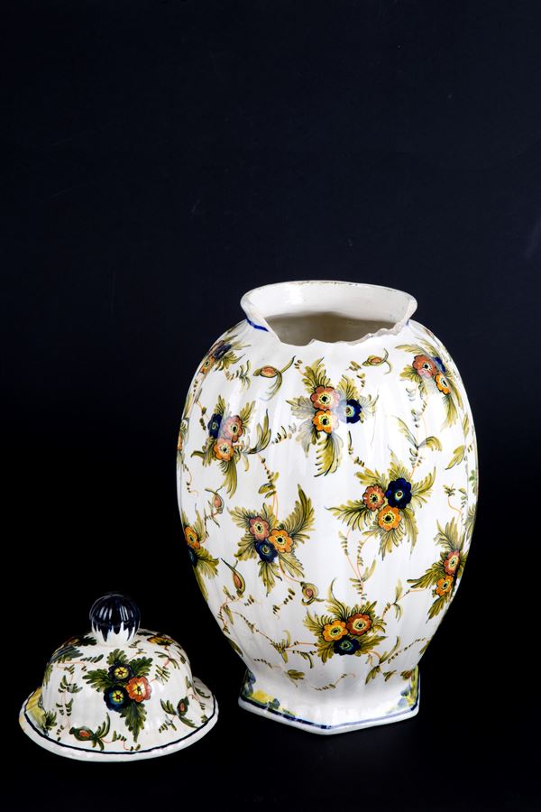 White majolica potiche with lid painted with floral motifs. Bassano. 20th century. Defects and shortcomings.