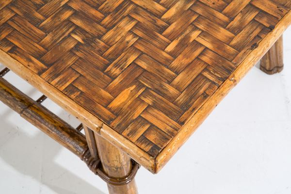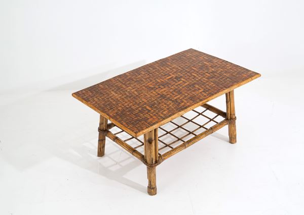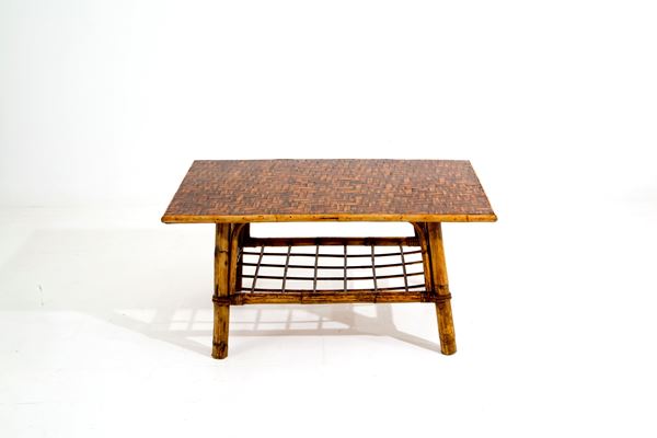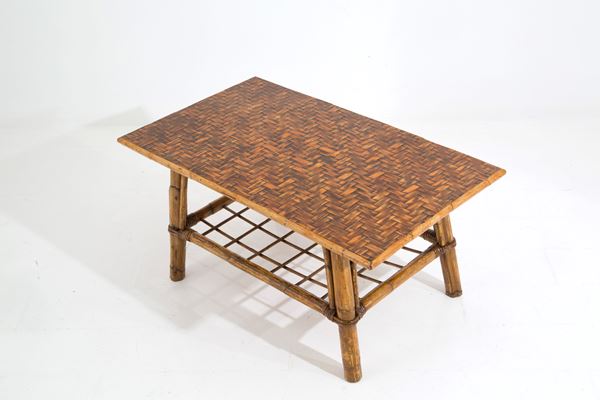 Woven rattan table with two levels and herringbone upper surface. 70's.