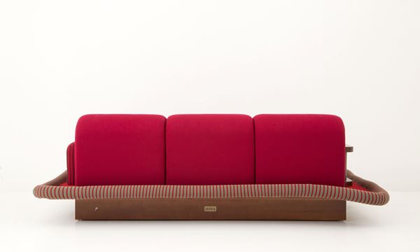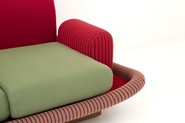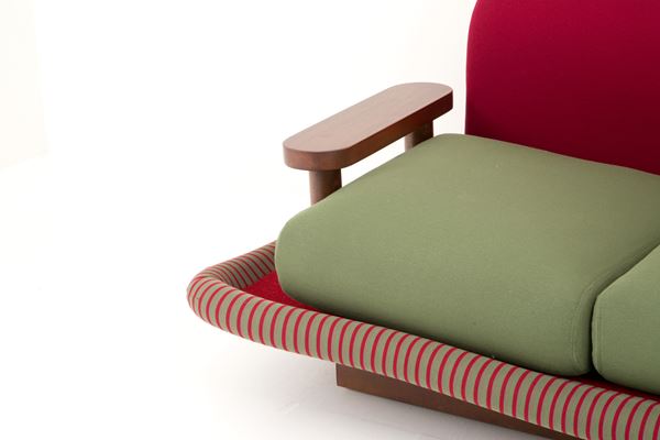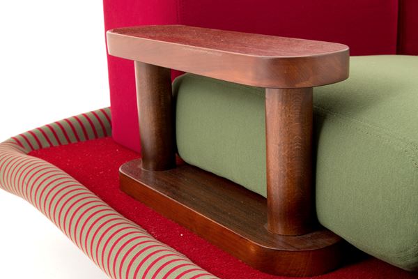 Two-seater sofa model Tappeto Volante in wood and polyurethane foam covered in velvet and red and green fabric. Side table in solid walnut. Production of BEDDING PATENTS, Casalguidi. 1974. With manufacturer's label on the back.