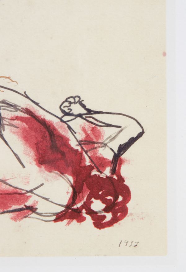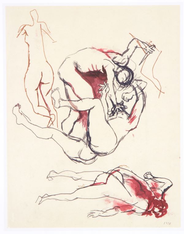 Round table in agglomerated stone with inlaid marble top and geometric decorations.