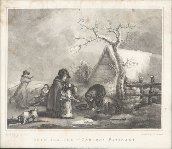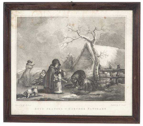 Three etchings on paper depicting "BOYS SKATING" (approx. 35x41.5 cm), "BOYS WHO STEAL IN A GARDEN" (approx. 35x41.5 cm) and "BOYS BY THE RIVER" (approx. 35x41.5 cm). In frame.