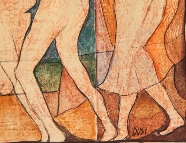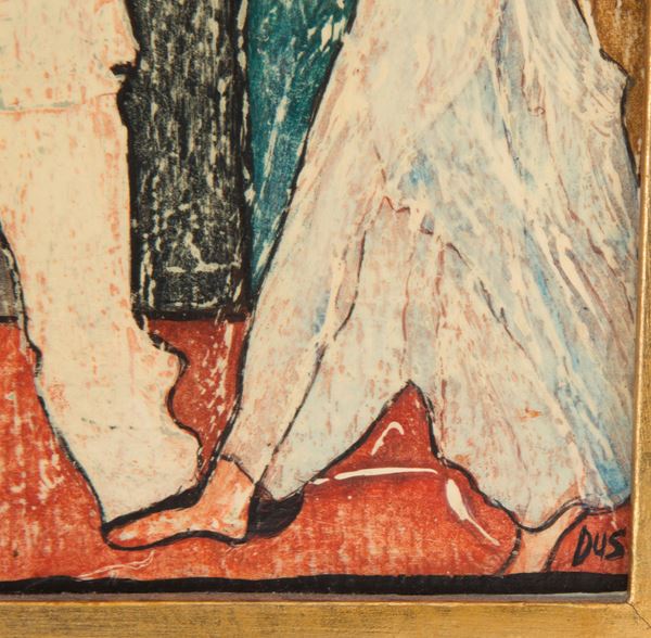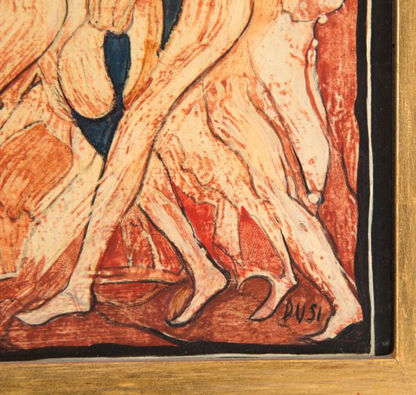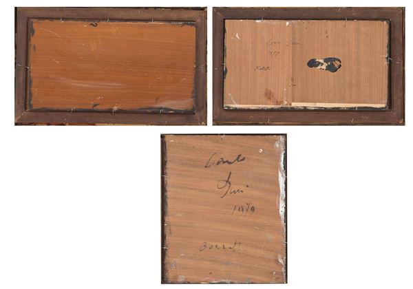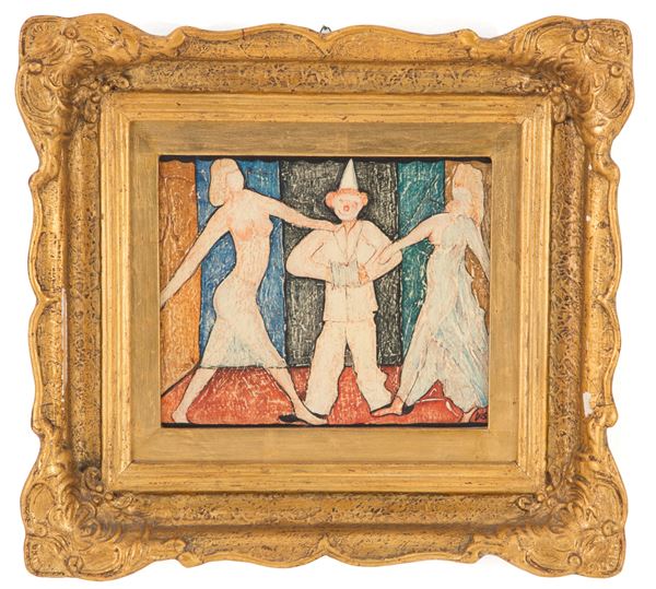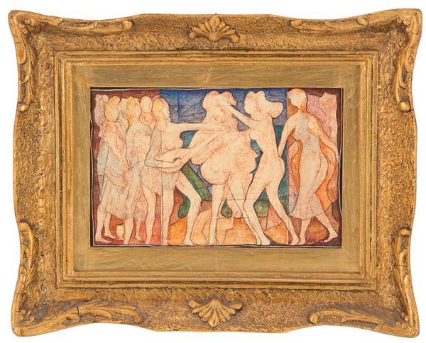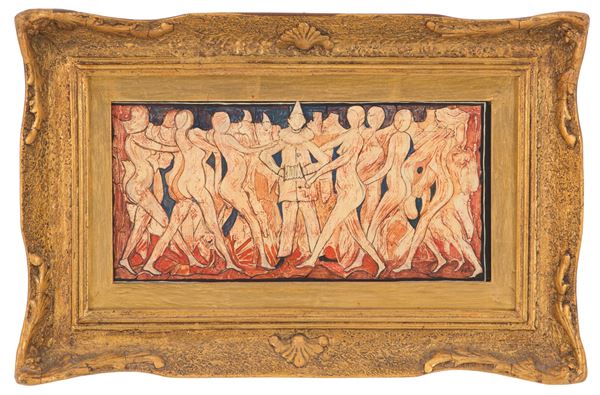 Three mixed techniques on tablet depicting "DANCING PARTIES". Signed lower right. Two countersigned and dated 1978 and 1979 on the reverse. In frame.