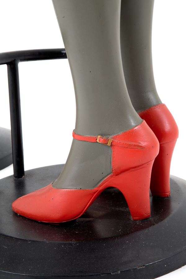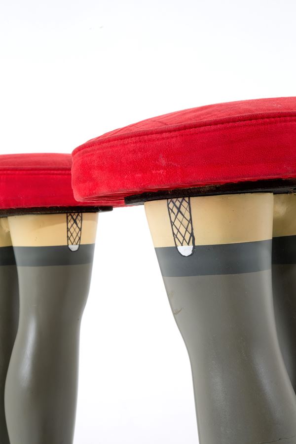 Two bar stools in the shape of female legs in colored resin with iron footrest and red fabric cushions.