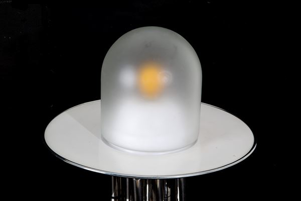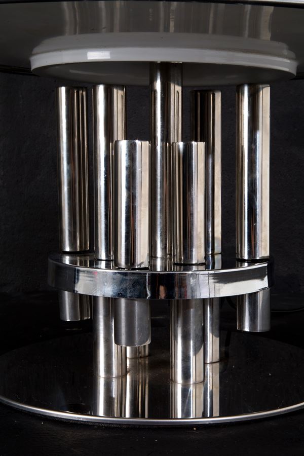 Ufo table lamp with chromed steel tubes, plastic disc and satin glass shade. Italian manufacture. 70's.