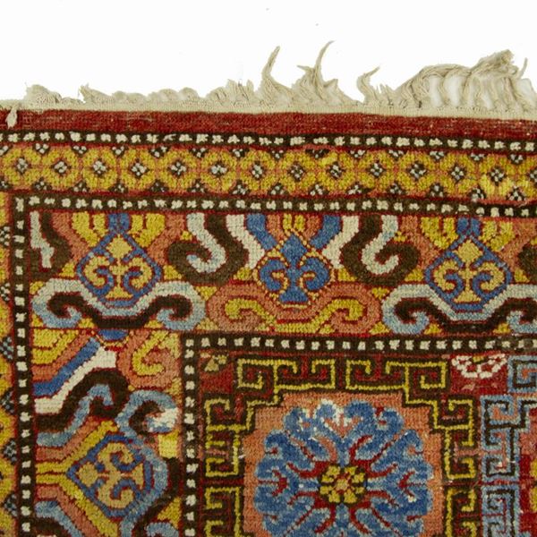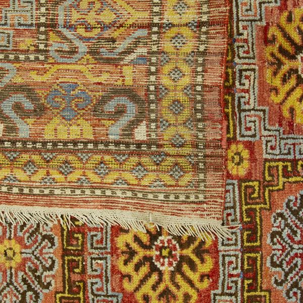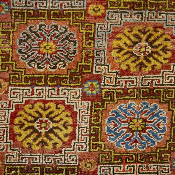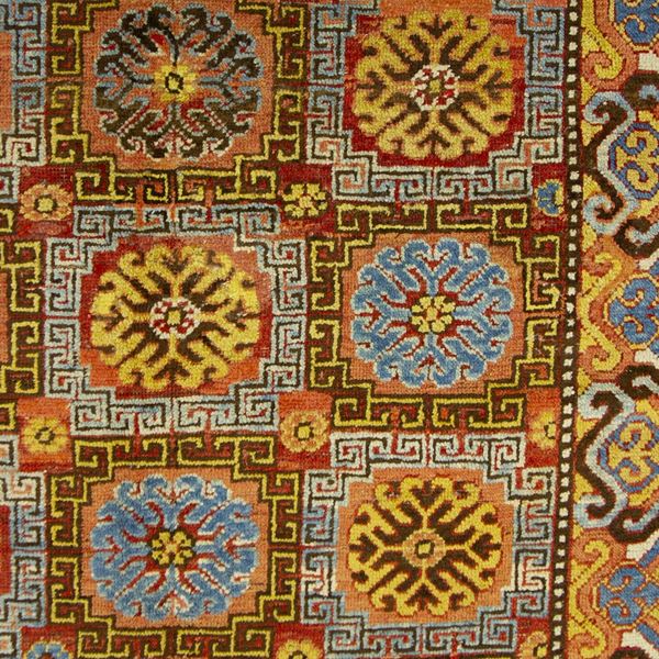Carpet Oasi of Khotan. East Turkestan. Second half of the 19th century. In good condition with small old field restorations. Published in the book Masterpieces from The-Te-Chun Wang Collection.