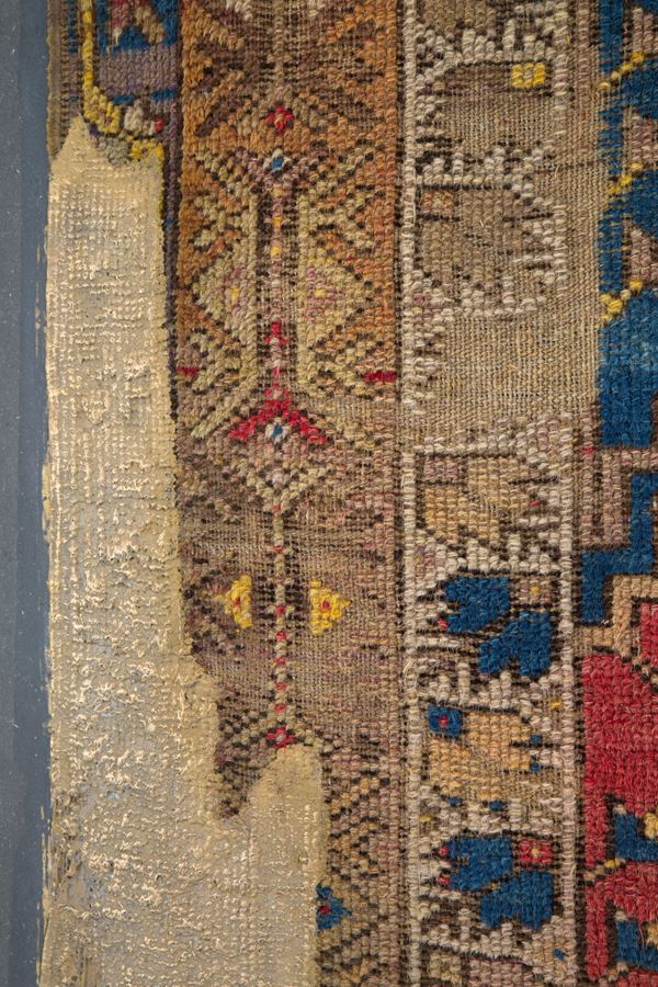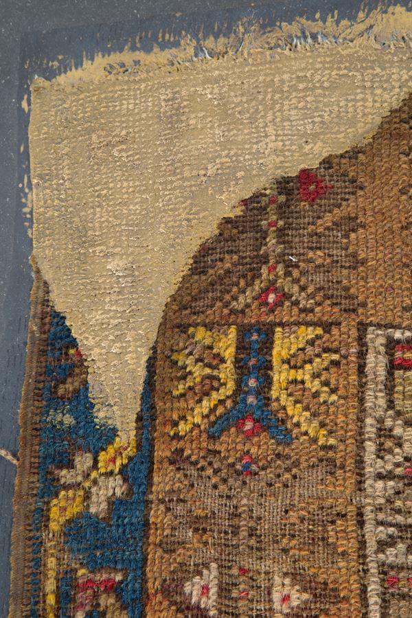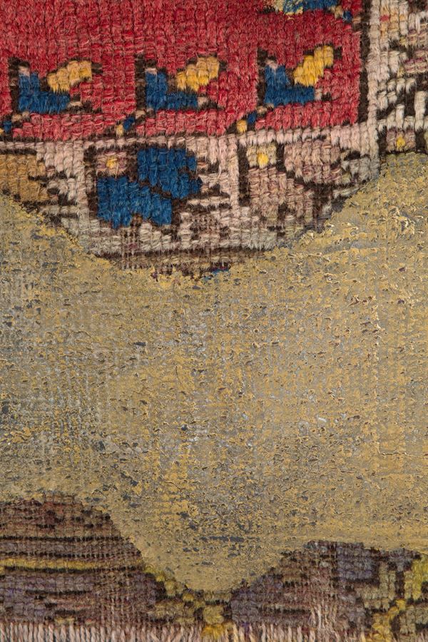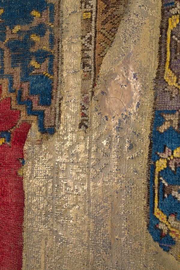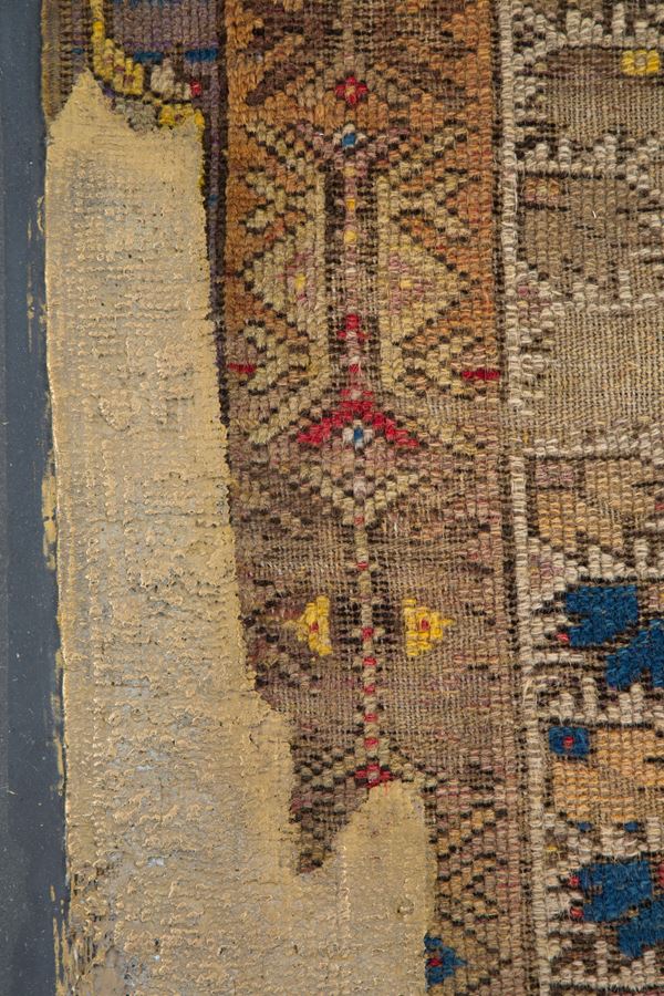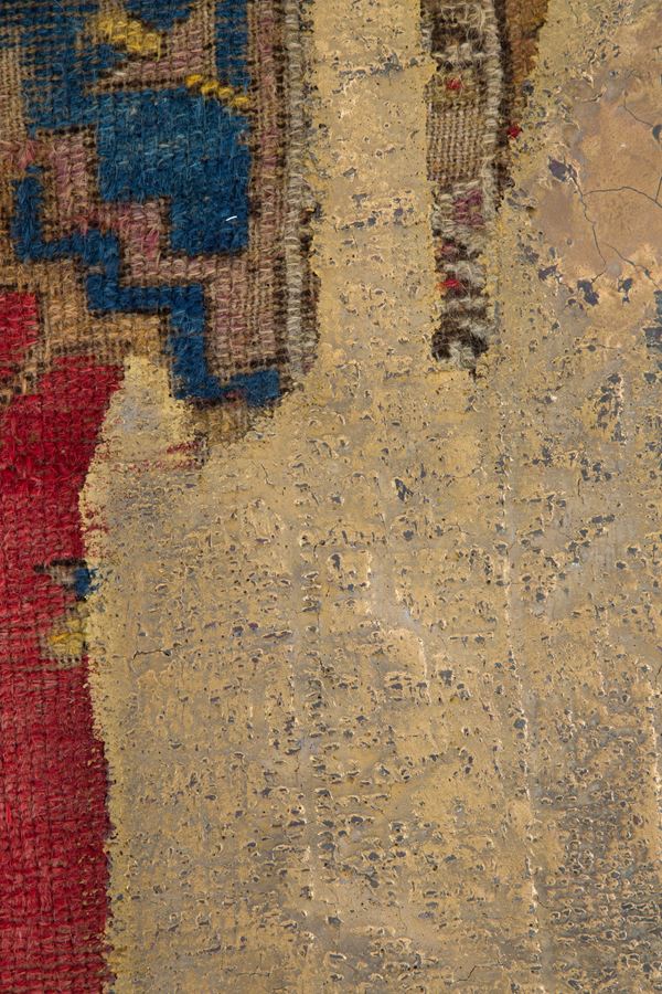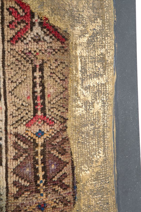 Panel mounted on wood Anatolian Kentsugi made by Tony Wetfloor, is part of the "CARPET RELOADED" project. 2019. The ancient Japanese tradition applied to an oriental textile. A cast of bronze that enhances the wear of the carpet by highlighting the worn warp and weft, giving it new life. Wetfloor's approach to art is fascinating, as it focuses on embellishing and restoring new artistic dignity and symbolic value to a textile object, in this case a carpet.