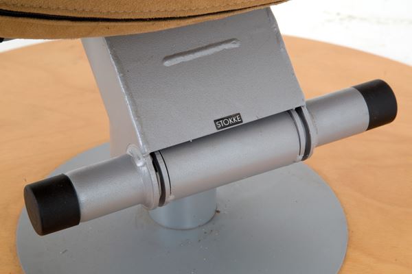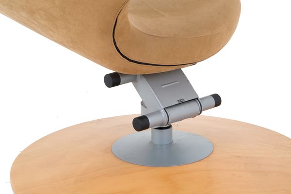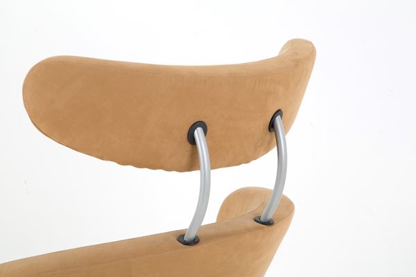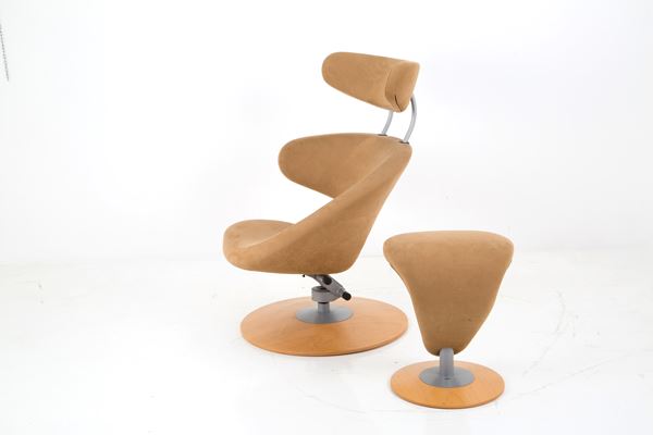 Armchair with ottoman mod. Peel in wood, metal and alcantara. Reclining and adjustable headrest. STOKKE production. With manufacturer's label at the base.