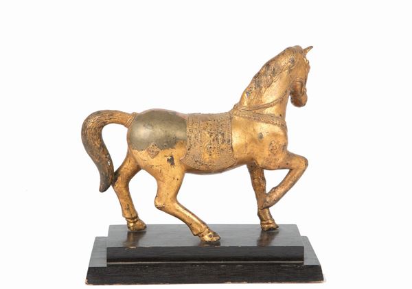 Partially gilded bronze sculpture depicting "HORSE". Wooden base. China. Defects.