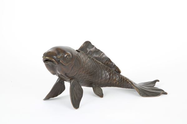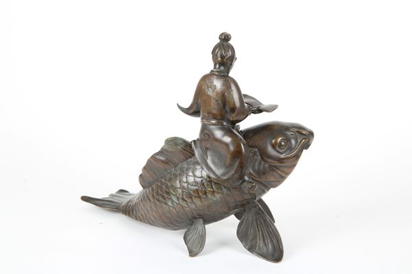 Bronze sculpture depicting "WISE READING SITTING ON A CARP". China.