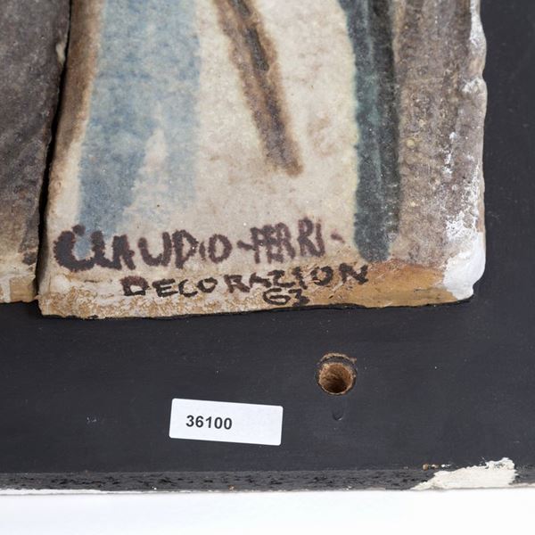 Ceramic panel applied on wood depicting ''DEER''. Signed lower right.