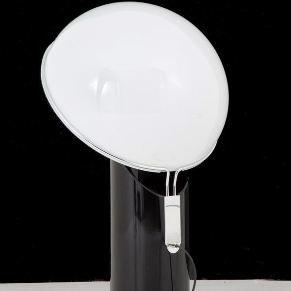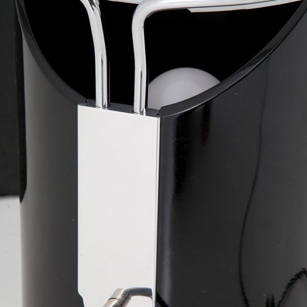 Ciot table lamp with structure in black resin, lampshade in opaline methacrylate, base and finishes in chromed metal. LUMENFORM production. 70's.