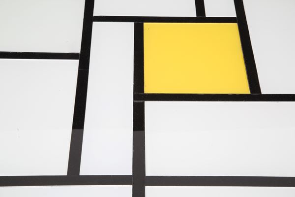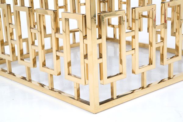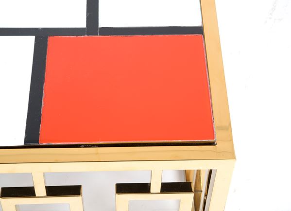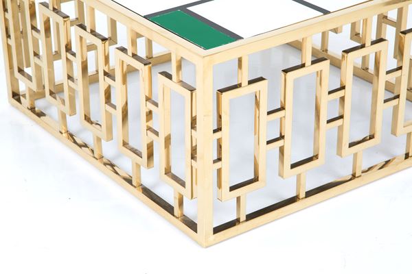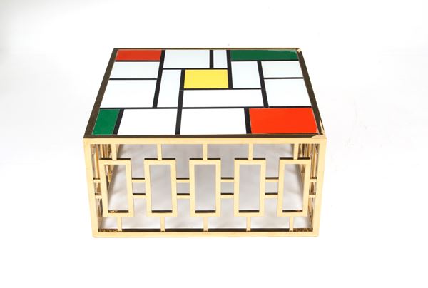 Coffee table in wood with mosaic applications in colored glass and base in gilded brass with geometric motifs. Murano.
