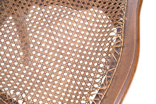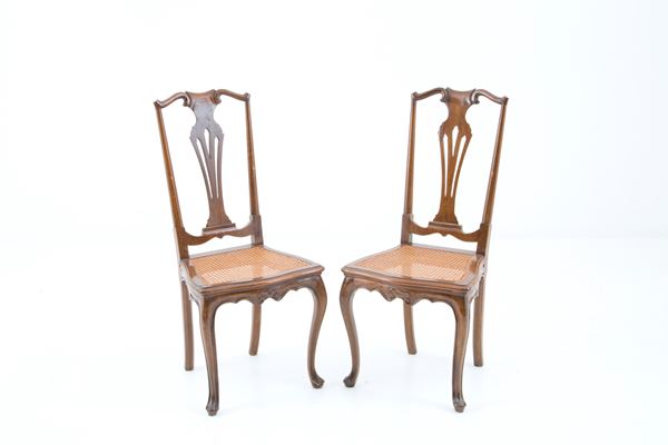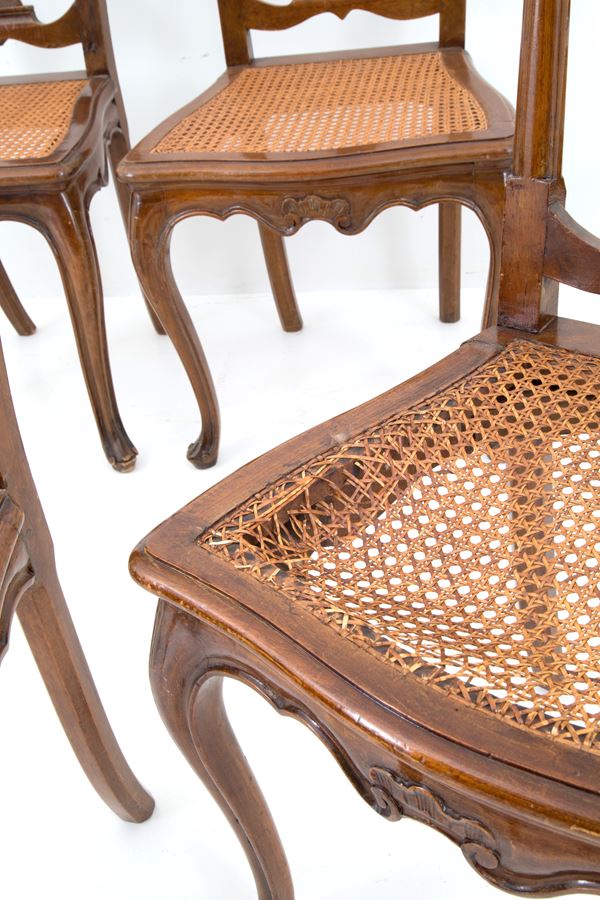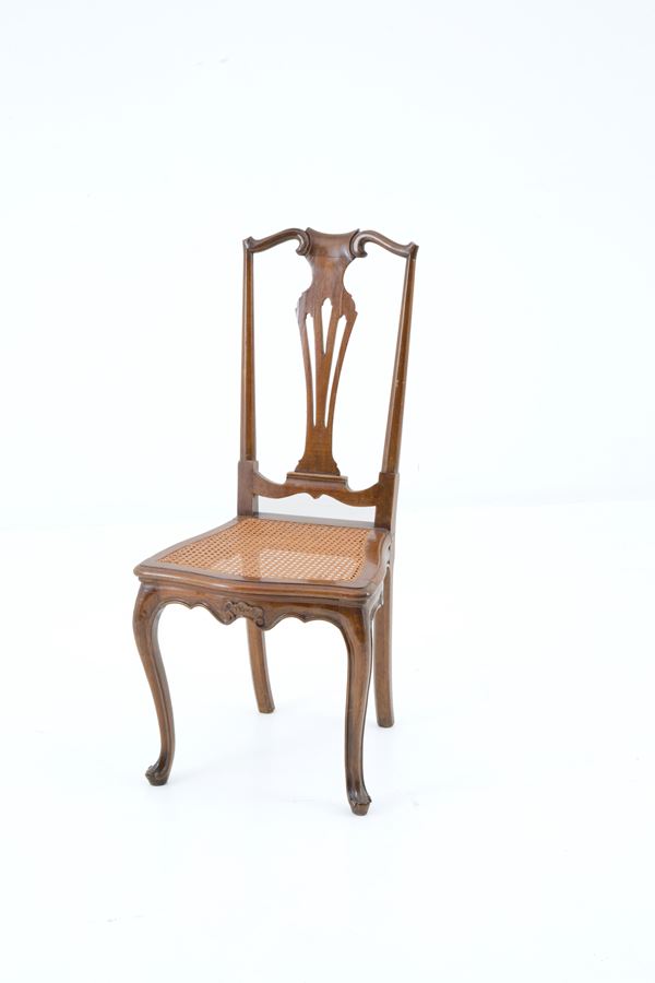 Eight chairs in walnut with perforated satchel, wavy legs and straw seat. Veneto. Early 19th century. Defects.
